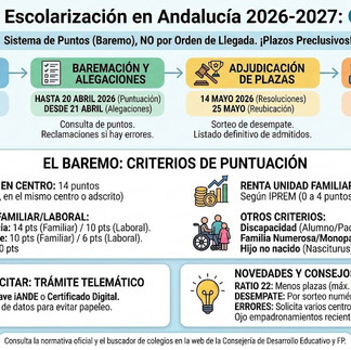 Del 1 al 31 de marzo, ambos inclusive, permanecerá abierto en Andalucía el plazo para la presentación de solicitudes de admisión correspondientes al curso escolar 2026/27. Se inicia de este modo el proceso de escolarización en el que participan todos los niños y niñas que se incorporan por primera vez al sistema educativo, tanto en centros públicos como privados concertados, así como el alumnado que cambie de centro escolar.